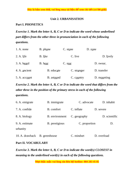 Đây là bản xem th , vu ử i lòng mua tài li u ệ đ xe ể m chi ti t ế (có l i ờ gi i ả ) Unit 2. URBANISATION Part I. PHONETICS