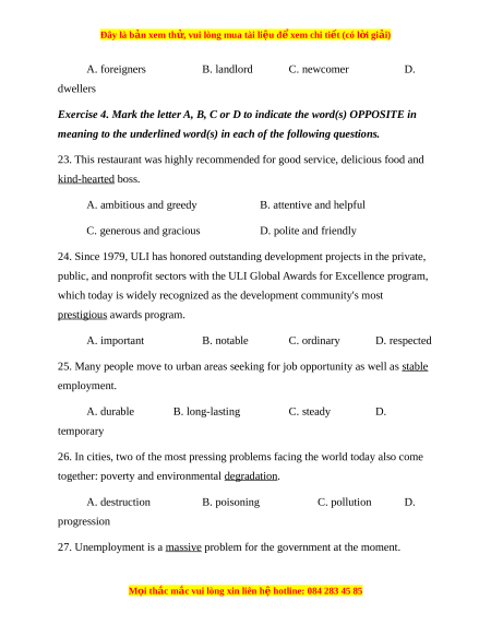 Exercise 4. Mark the letter A, B, C or D to indicate the word(s) OPPOSITE in