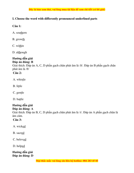 I. Choose the word with differently pronounced underlined parts Câu 1: A. southern B. growth C. within D. although Hướng dẫn giải Đáp án đúng: B