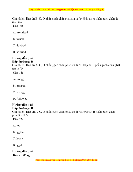 Giải thích: Đáp án B, C, D phần gạch chân phát âm là /h/. Đáp án A phần gạch chân là âm câm. Câu 10: A. promised B. raised C. devised D. advised Hướng dẫn giải Đáp án đúng: B