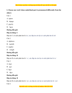 I. Choose one word whose underlined part is pronounced differently from the others: Câu 1. A. nature B. change C. gravity D. basic Hướng dẫn giải Đáp án đúng: C