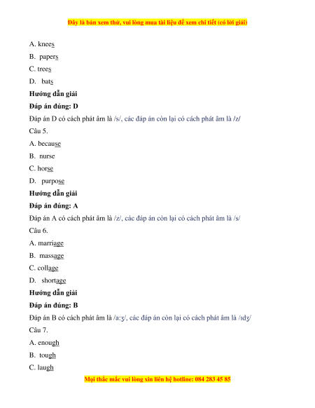 Đáp án D có cách phát âm là /s/, các đáp án còn lại có cách phát âm là /z/ Câu 5. A. because B. nurse C. horse D. purpose Hướng dẫn giải Đáp án đúng: A