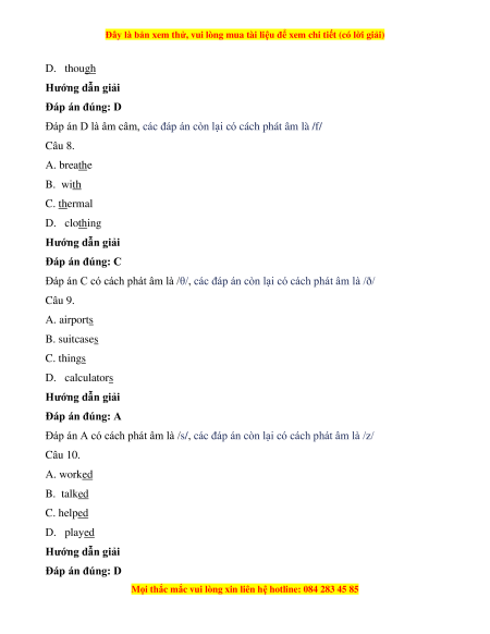 Đáp án C có cách phát âm là /θ/, các đáp án còn lại có cách phát âm là /ð/ Câu 9. A. airports B. suitcases C. things D. calculators Hướng dẫn giải Đáp án đúng: A