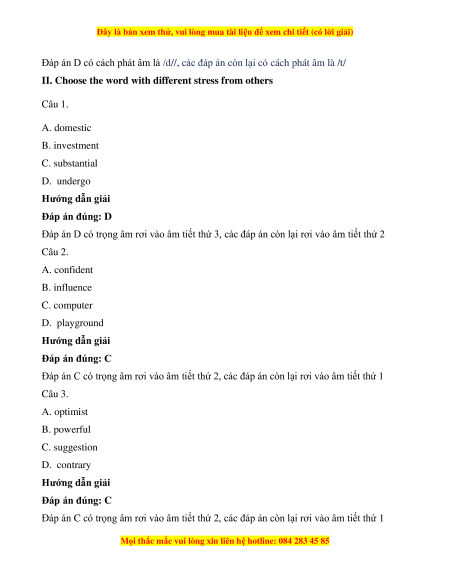 II. Choose the word with different stress from others Câu 1. A. domestic B. investment C. substantial D. undergo Hướng dẫn giải Đáp án đúng: D