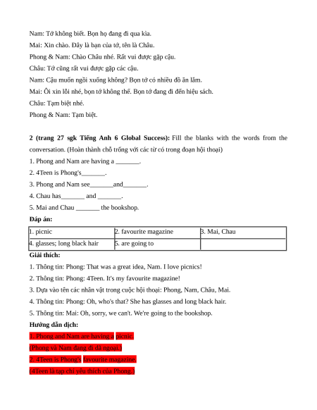 5. Mai and Chau _______ the bookshop. Đáp án: 1. picnic 2. favourite magazine 3. Mai, Chau 4. glasses; long black hair 5. are going to Giải thích: