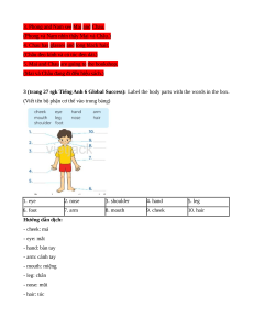 (Viết tên bộ phận cơ thể vào trong bảng) 1. eye 2. nose 3. shoulder 4. hand 5. leg 6. foot 7. arm 8. mouth 9. cheek 10. hair Hướng dẫn dịch: - cheek: má - eye: mắt - hand: bàn tay - arm: cánh tay - mouth: miệng - leg: chân - nose: mũi - hair: tóc - shoulder: vai - foot: bàn chân