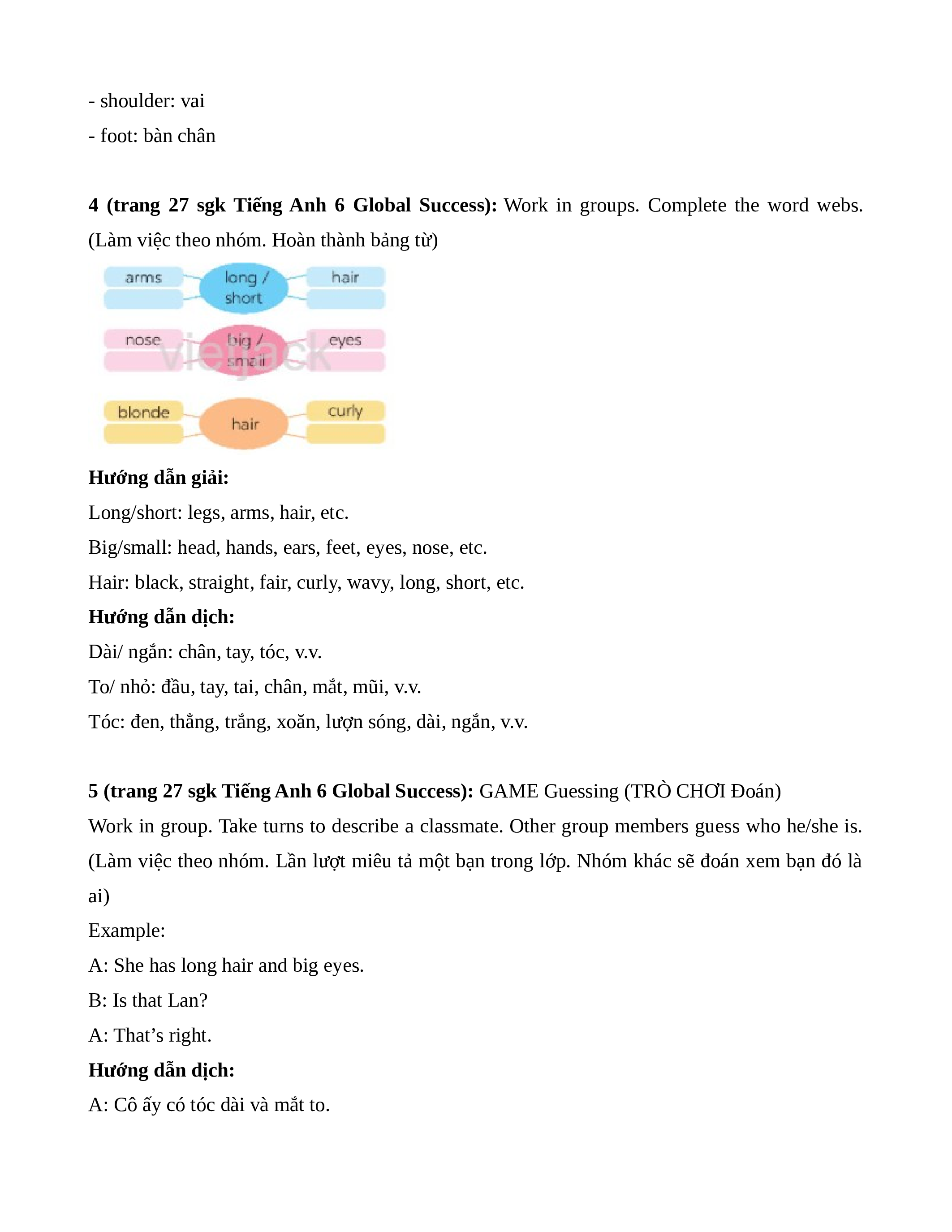 A: She has long hair and big eyes. B: Is that Lan? A: That’s right. Hướng dẫn dịch: