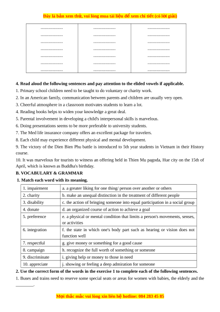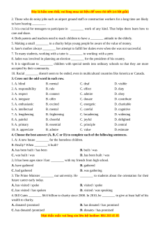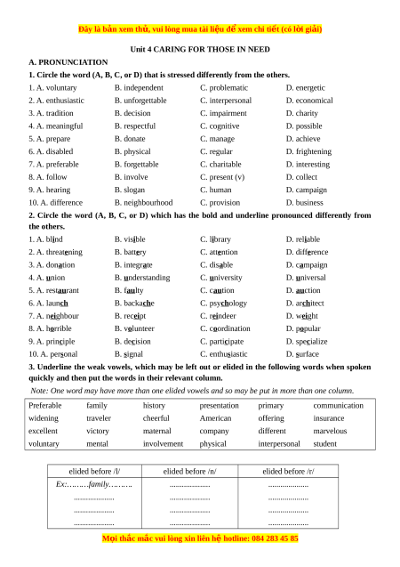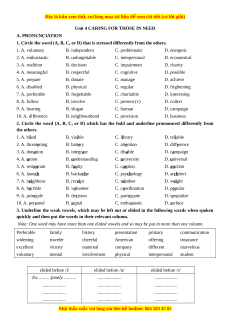 1. Circle the word (A, B, C, or D) that is stressed differently from the others. 1. A. voluntary B. independent C. problematic D. energetic 2. A. enthusiastic B. unforgettable C. interpersonal D. economical 3. A. tradition B. decision C. impairment D. charity 4. A. meaningful B. respectful C. cognitive D. possible 5. A. prepare B. donate C. manage D. achieve 6. A. disabled B. physical C. regular D. frightening 7. A. preferable B. forgettable C. charitable D. interesting 8. A. follow B. involve C. present (v) D. collect 9. A. hearing B. slogan C. human D. campaign 10. A. difference B. neighbourhood C. provision D. business