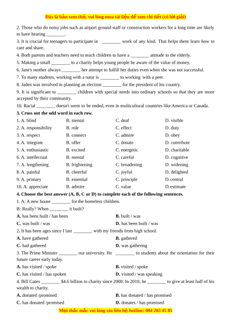 2. Circle the word (A, B, C, or D) which has the bold and underline pronounced differently from the others. 1. A. blind B. visible C. library D. reliable 2. A. threatening B. battery C. attention D. difference 3. A. donation B. integrate C. disable D. campaign 4. A. union B. understanding C. university D. universal 5. A. restaurant B. faulty C. caution D. auction 6. A. launch B. backache C. psychology D. architect 7. A. neighbour B. receipt C. reindeer D. weight 8. A. horrible B. volunteer C. coordination D. popular 9. A. principle B. decision C. participate D. specialize 10. A. personal B. signal C. enthusiastic D. surface
