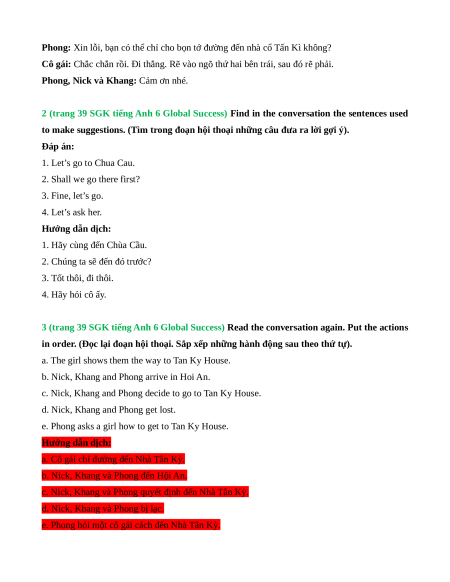 to make suggestions. (Tìm trong đoạn hội thoại những câu đưa ra lời gợi ý). Đáp án: 1. Let’s go to Chua Cau. 2. Shall we go there first? 3. Fine, let’s go. 4. Let’s ask her. Hướng dẫn dịch: