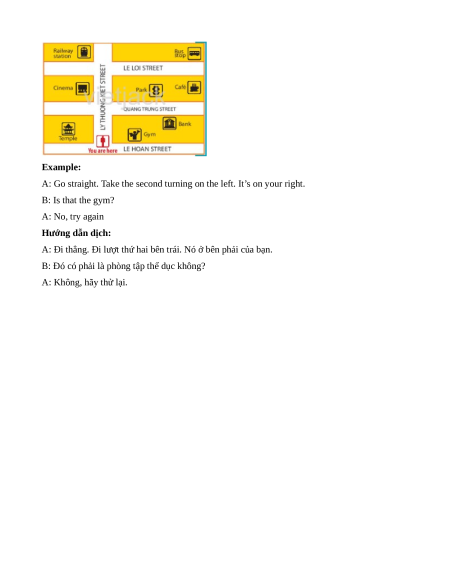 A: Go straight. Take the second turning on the left. It’s on your right. B: Is that the gym? A: No, try again Hướng dẫn dịch:
