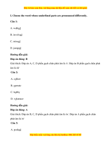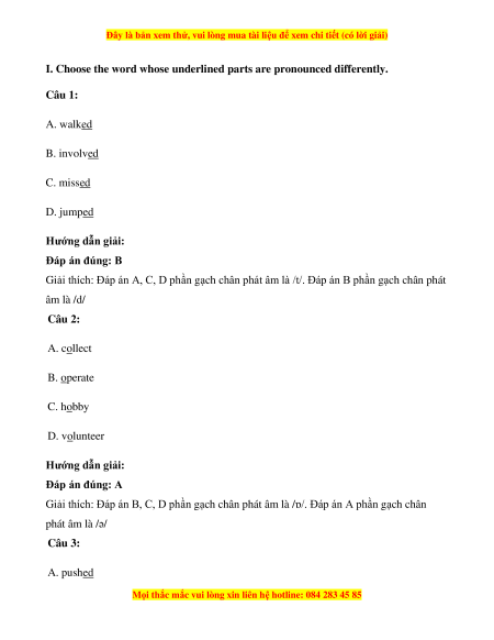 I. Choose the word whose underlined parts are pronounced differently. Câu 1: A. walked B. involved C. missed D. jumped Hướng dẫn giải: Đáp án đúng: B