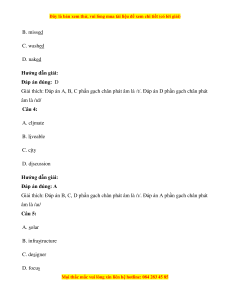 Giải thích: Đáp án B, C, D phần gạch chân phát âm là /ɪ/. Đáp án A phần gạch chân phát âm là /aɪ/ Câu 5: A. solar B. infrastructure C. designer D. focus