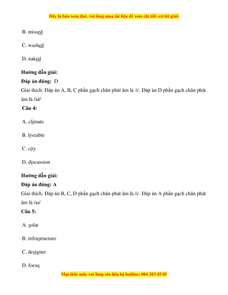 Giải thích: Đáp án A, B, C phần gạch chân phát âm là /t/. Đáp án D phần gạch chân phát âm là /ɪd/ Câu 4: A. climate B. liveable C. city D. discussion Hướng dẫn giải: Đáp án đúng: A