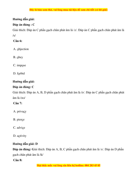 Giải thích: Đáp án C phần gạch chân phát âm là /z/. Đáp án C phần gạch chân phát âm là /s/ Câu 6: A. objection B. obey C. impose D. forbid Hướng dẫn giải: Đáp án đúng: C