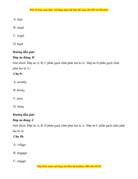 Giải thích: Đáp án A, B, D phần gạch chân phát âm là /s/. Đáp án C phần gạch chân phát âm là /z/ Câu 10: A. village B. luggage C. engage