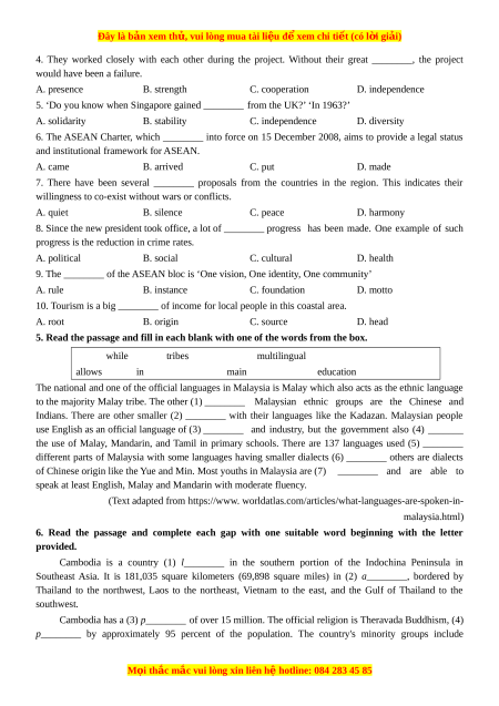 1. Circle the word (A, B, C, or D) that is stressed differently from the others. A. competition B. interference C. economy D. volunteering A. talented B. beautiful C. awarded D. passionate A. solidarity B. university C. population D. diversity A. possibility B. community C. independence D. information A. Singapore B. Cambodia C. Malaysia D. Myanmar