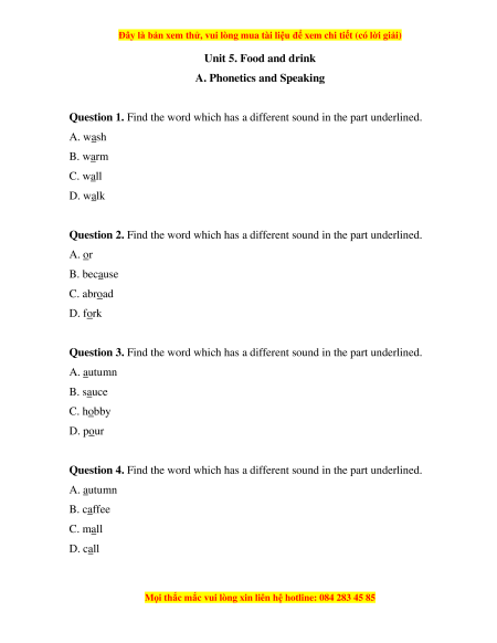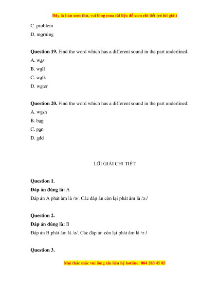 Question 1. Find the word which has a different sound in the part underlined. A. wash B. warm C. wall D. walk