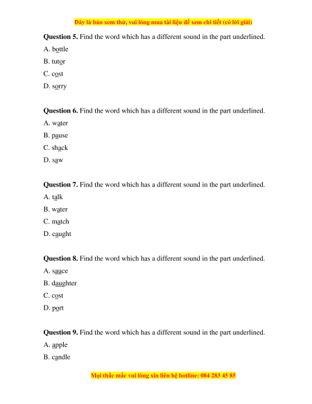 Question 5. Find the word which has a different sound in the part underlined. A. bottle B. tutor C. cost D. sorry