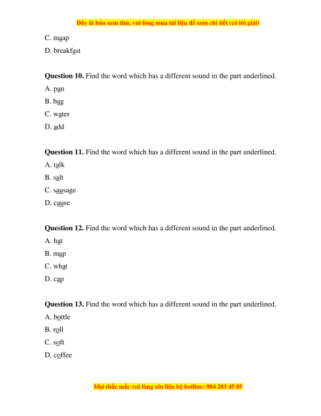 Question 11. Find the word which has a different sound in the part underlined. A. talk B. salt C. sausage D. cause