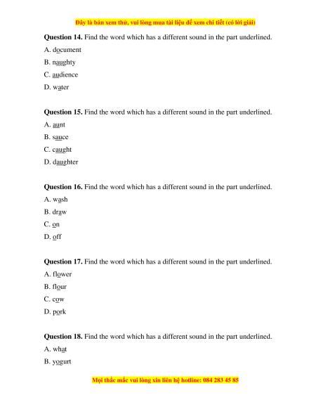 Question 14. Find the word which has a different sound in the part underlined. A. document B. naughty C. audience D. water