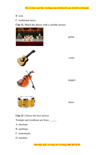 Câu 11. Match the phrase with a suitable picture. guitar violin puppet drum