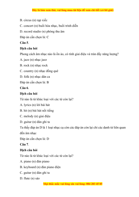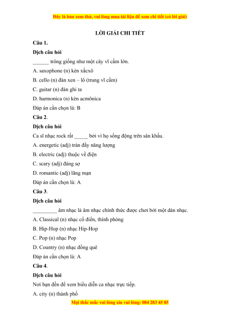 D. Country (n) nhạc đồng quê Đáp án cần chọn là: A Câu 4. Dịch câu hỏi