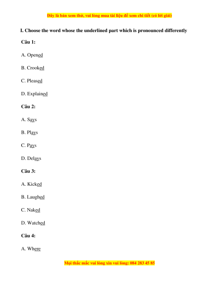 I. Choose the word whose the underlined part which is pronounced differently Câu 1: A. Opened B. Crooked C. Pleased D. Explained Câu 2: A. Says B. Plays C. Pays D. Delays Câu 3: A. Kicked B. Laughed C. Naked D. Watched Câu 4: A. Where