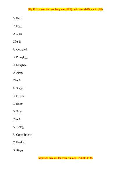 B. Here C. Fear D. Dear Câu 5: A. Coughed B. Ploughed C. Laughed D. Fixed Câu 6: A. Soften B. Fifteen C. Enter D. Party Câu 7: A. Holds B. Compliments C. Replies D. Sings