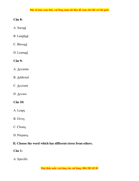 Câu 8: A. Sacred B. Laughed C. Blessed D. Learned Câu 9: A. Accurate B. Addicted C. Account D. Accuse Câu 10: A. Leaps B. Gives C. Cleans D. Prepares