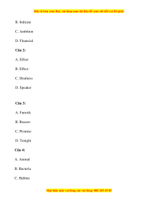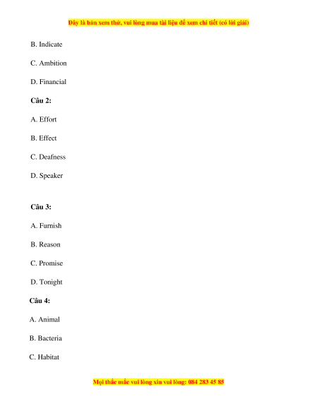 B. Indicate C. Ambition D. Financial Câu 2: A. Effort B. Effect C. Deafness D. Speaker Câu 3: A. Furnish B. Reason C. Promise D. Tonight Câu 4: A. Animal B. Bacteria C. Habitat