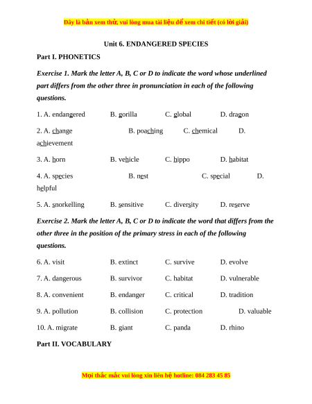 part differs from the other three in pronunciation in each of the following questions. 1. A. endangered B. gorilla C. global D. dragon 2. A. change B. poaching C. chemical D. achievement 3. A. horn B. vehicle C. hippo D. habitat 4. A. species B. nest C. special D. helpful 5. A. snorkelling B. sensitive C. diversity D. reserve