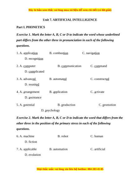 other three in the position of the primary stress in each of the following questions. 6. A. machine B. robot C. human D. fiction 7. A. applicable B. automation C. artificial D. evolution M i