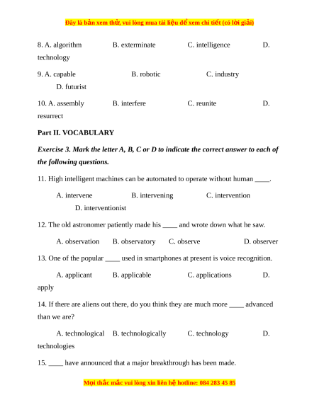 Đây là bản xem th , vu ử i lòng mua tài li u ệ đ xe ể m chi ti t ế (có l i ờ gi i ả ) 8. A. algorithm B. exterminate C. intelligence D. technology 9. A. capable B. robotic C. industry D. futurist 10. A. assembly B. interfere C. reunite D. resurrect Part II. VOCABULARY