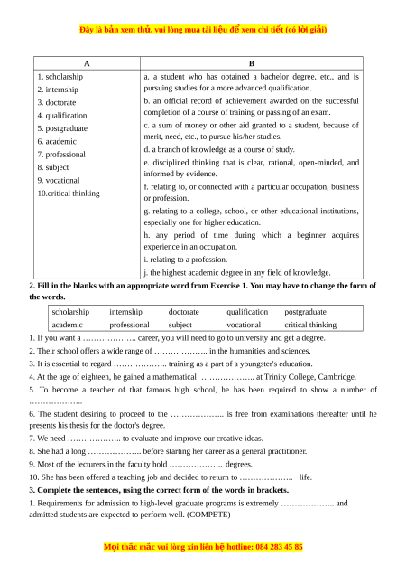 2. Fill in the blanks with an appropriate word from Exercise 1. You may have to change the form of the words. scholarship internship doctorate qualification postgraduate academic professional subject vocational critical thinking