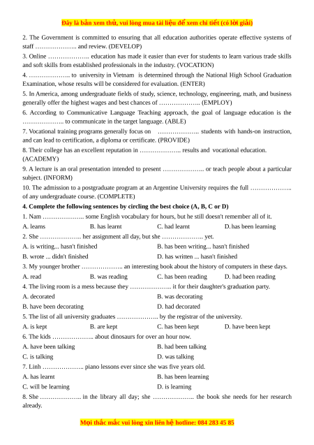1. Nam ……………….. some English vocabulary for hours, but he still doesn't remember all of it. A. learns B. has learnt C. had learnt D. has been learning