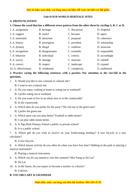 Unit 8 OUR WORLD HERITAGE SITES A. PRONUNCIATION