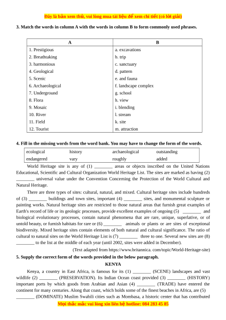 3. Match the words in column A with the words in column B to form commonly used phrases. A B 1. Prestigious a. excavations 2. Breathtaking b. trip 3. harmonious c. sanctuary 4. Geological d. pattern 5. Scenic e. and fauna 6. Archaeological f. landscape complex 7. Underground g. school 8. Flora h. view 9. Mosaic i. blending 10. River l. stream 11. Field k. site 12. Tourist m. attraction