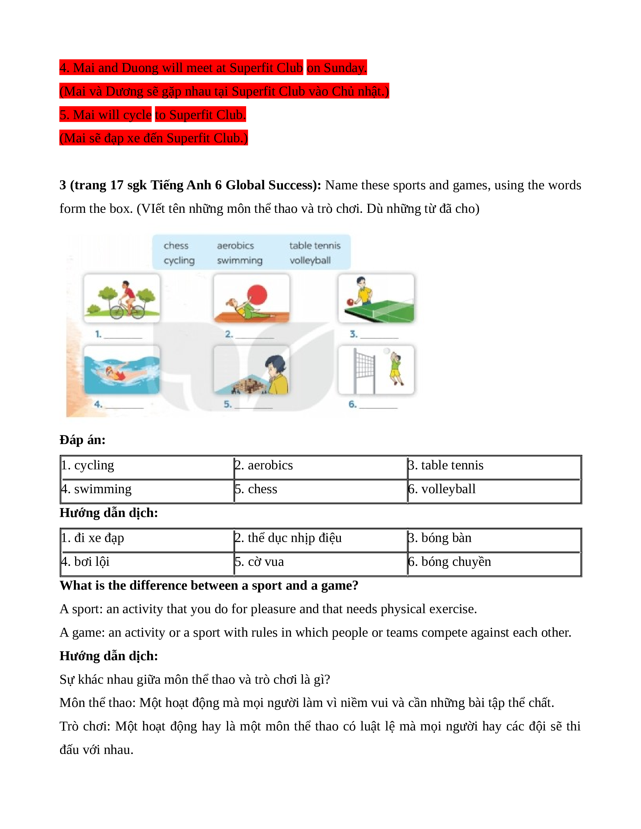 form the box. (VIết tên những môn thể thao và trò chơi. Dù những từ đã cho) Đáp án: 1. cycling 2. aerobics 3. table tennis 4. swimming 5. chess 6. volleyball Hướng dẫn dịch: 1. đi xe đạp 2. thể dục nhịp điệu 3. bóng bàn 4. bơi lội 5. cờ vua 6. bóng chuyền