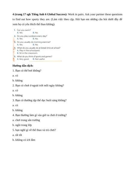 to find out how sporty they are. (Làm việc theo cặp. Hỏi bạn em những câu hỏi dưới đây để