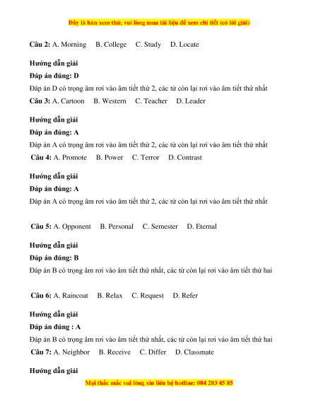 Câu 7: A. Neighbor B. Receive C. Differ D. Classmate Hướng dẫn giải