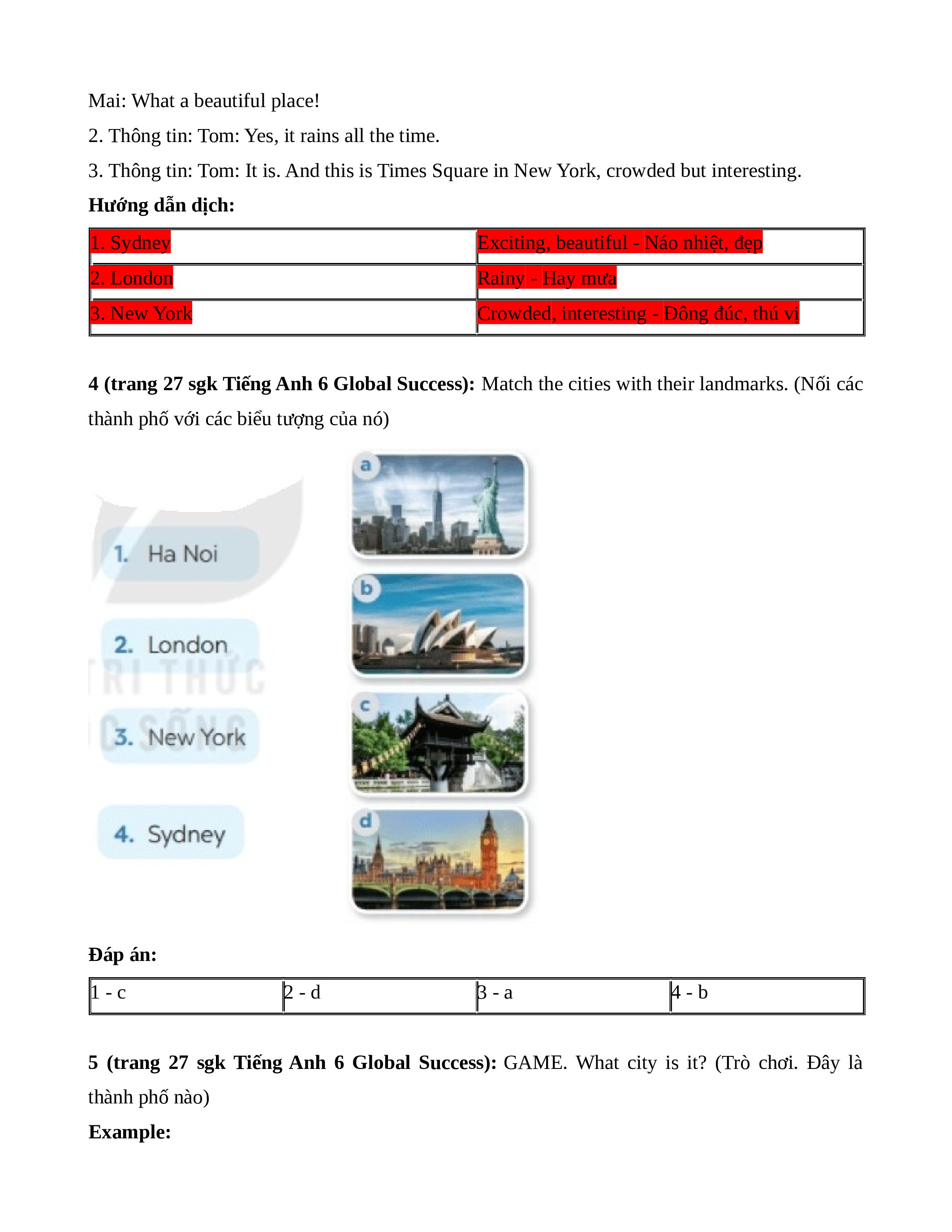 5 (trang 27 sgk Tiếng Anh 6 Global Success): GAME. What city is it? (Trò chơi. Đây là thành phố nào) Example: A: What’s it like? B: It has beautiful beaches. C: Is it in Australia. B: Yes, it is. A: It’s Sydney. B: Right. Hướng dẫn dịch: A: Nơi này như thế nào?