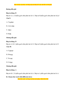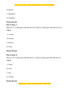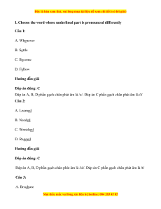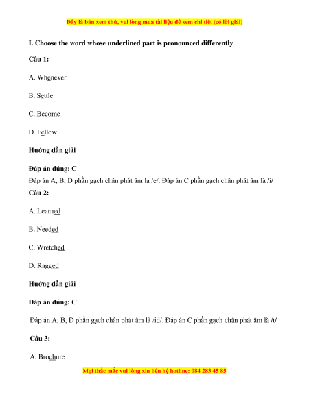 I. Choose the word whose underlined part is pronounced differently Câu 1: A. Whenever B. Settle C. Become D. Fellow Hướng dẫn giải Đáp án đúng: C
