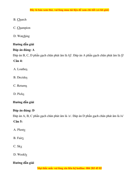 Đáp án B, C, D phần gạch chân phát âm là /tʃ/. Đáp án A phần gạch chân phát âm là /ʃ/ Câu 4: A. Loathes B. Decides C. Returns D. Picks Hướng dẫn giải Đáp án đúng: D