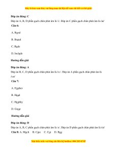 Đáp án B, C, D phần gạch chân phát âm là /ʊ:/. Đáp án A phần gạch chân phát âm là /ʊə/ Câu 7: A. Feather B. Head C. Healthy D. Great Hướng dẫn giải Đáp án đúng: D