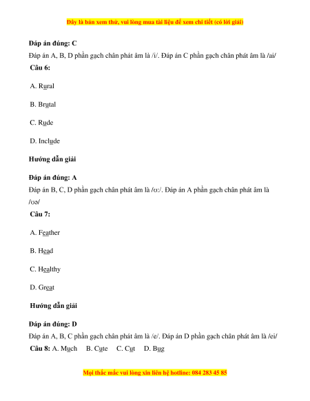 Đáp án A, B, D phần gạch chân phát âm là /i/. Đáp án C phần gạch chân phát âm là /ai/ Câu 6: A. Rural B. Brutal C. Rude D. Include Hướng dẫn giải Đáp án đúng: A