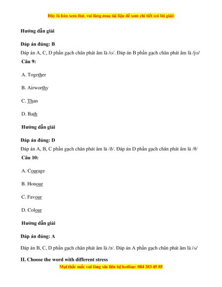 Đáp án A, B, C phần gạch chân phát âm là /ð/. Đáp án D phần gạch chân phát âm là /θ/ Câu 10: A. Courage B. Honour C. Favour D. Colour Hướng dẫn giải Đáp án đúng: A