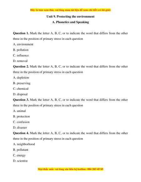 three in the position of primary stress in each question A. depletion B. preserving C. chemical D. disposal