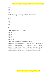 Câu 1. Số x là ước chung của số a và số b nếu: A. x∈Ư(a) và x∈B(b) B. x⊂Ư(a)và x⊂Ư(b) C. x∈Ư(a) và x∈Ư(b) D. x∉Ư(a) và x∉Ư(b)