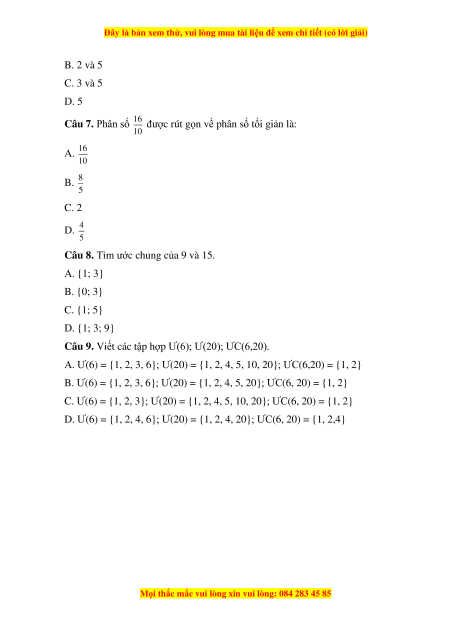 Đáp án cần chọn là: C Câu 7. ƯC(15; 10) = 2. Ta chia cả 16 tử và mẫu của cho 2 được: 10 16 16 : 2 8 = = 10 10 : 2 5 Đáp án cần chọn là: B Câu 8. - Ta có: